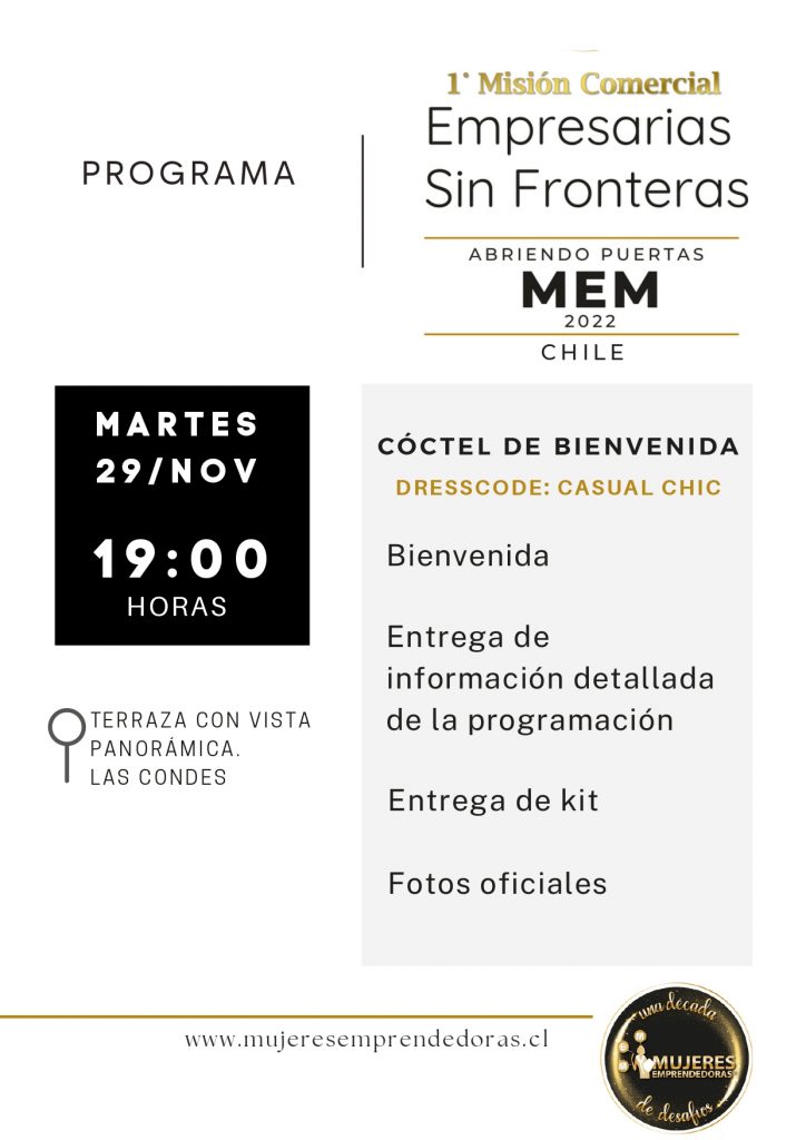 Este martes 29 de noviembre a las 19.00 horas se dar el puntapi inicial a la 1era Misin Comercial en Chile de Mujeres Emprendedoras ?Empresarias sin fronteras, abriendo Puertas Mem?, iniciativa liderada por Johanna Reyes, Directora Ejecutiva de Comunidad Mujeres Emprendedoras, en la que participarn representantes Colombia y Puerto Rico y que se extender hasta el viernes 2 de diciembre, oportunidad nica para fortalecer lazos de colaboracin y comerciales con grandes emprendedoras y representantes latinoamericanas.