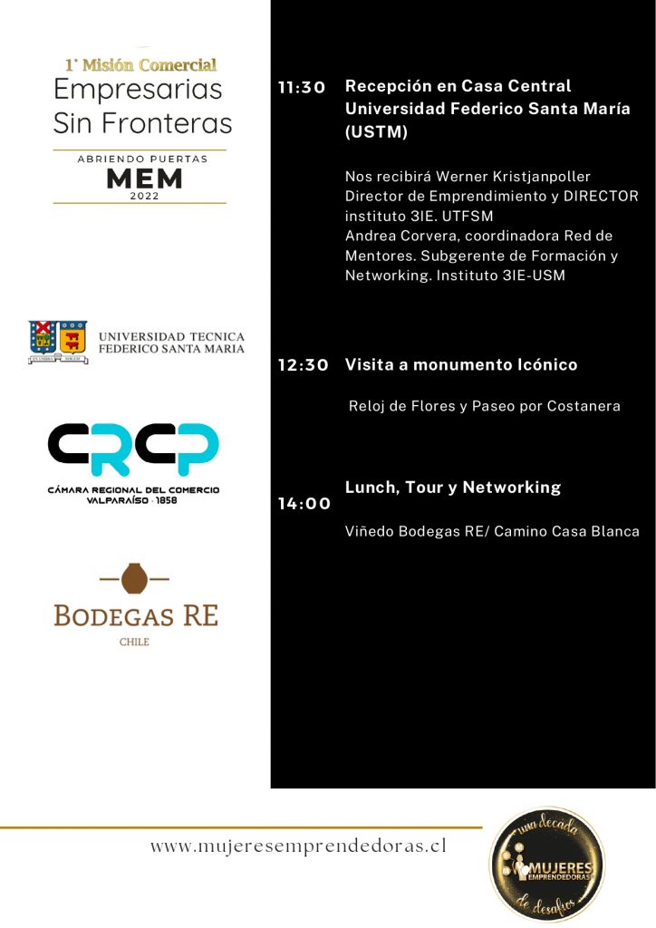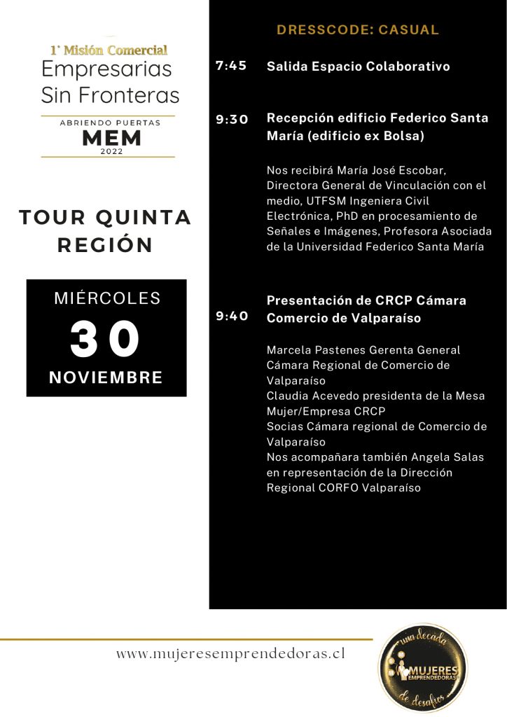 El encuentro, incluye un tour por la Quinta Regin para el segundo da (mircoles 30) de actividades, donde se visitar la Cmara de Comercio de Valparaso, la Universidad Federico Santa Mara, la Incubadora de Negocios Chrysalis, se desarrollar un conversatorio con empresarias y emprendedoras de la V Regin y, para terminar la jornada, se realizar una visita guiada al Viedo Bodegas RE, en Casa Blanca.
