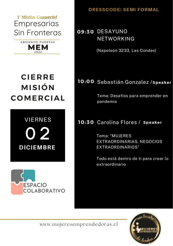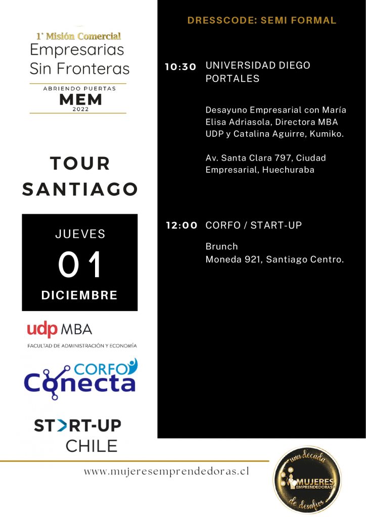 En el tercer da (jueves 1), se tiene preparado un tour por Santiago que contempla un desayuno empresarial con Mara Elisa Adriasola, Directora MBA de la U. Diego Portales, con Catalina Aguirre y Kumiko; una visita a Corfo, Startup Chile y un brunch en el centro histrico de la capital. Finalmente, para el cierre (viernes 2), se tiene contemplado un desayuno networking en Espacio Colaborativo, el centro de operaciones de MEM, que contar con la exposicin de Sebastin Gonzlez sobre ?Los desafos para emprender en pandemia? y de Carolina Flores sobre ?Mujeres extraordinarias, negocios extraordinarios?.