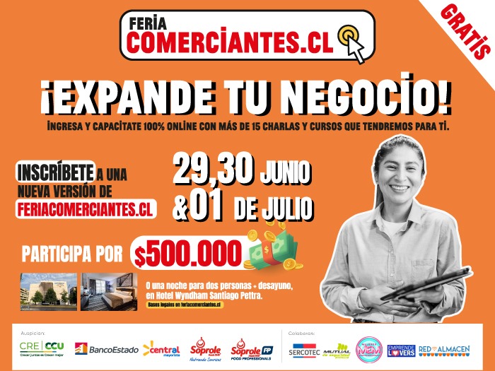Ya lo sabes, si quieres participar por este ESPECTACULAR monto en dinero, inscríbete en www.feriacomerciante.cl. Si es que te inscribiste y no pudiste revisar la Feria los días 29 y 30 de junio, no te preocupes, porque el sábado 1 de julio podrás de igual forma disfrutar de charlas y capacitaciones en la sección on demand. No pierdas esta oportunidad de ganarte MEDIO MILLÓN de pesos y de capacitarte para seguir creciendo, te esperamos en la Gran Feria Comerciantes 2023.