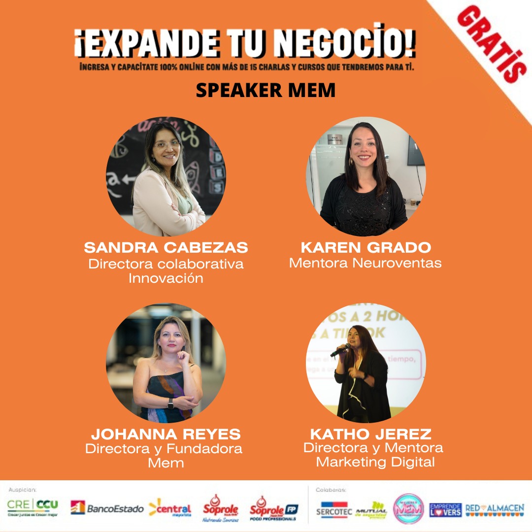 En la cita dirán presente Sandra Cabezas, directora de Innovación de Mem; Karen Grado, mentora de Mem y experta en neuroventas; Katho Jerez, mentora de Mem y experta en RR.SS.; y Johanna Reyes, Directora Ejecutiva de Mem con su presentación ?10 Pasos para Emprender con Propósito".