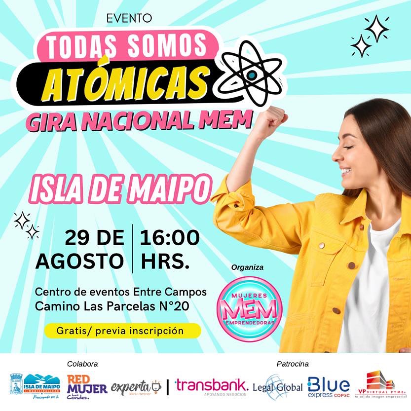 La exitosa Gira Nacional ?Todas Somos Atómicas? de Comunidad Mujeres Emprendedoras sigue recorriendo nuestro país tras triunfales presentaciones en Santiago, Rancagua y Coquimbo, para en esta cuarta edición aterrizar en Isla de Maipo, oportunidad en que cientos de emprendedoras podrán disfrutar de capacitaciones, talleres, charlas y concursos con el objetivo de poder potenciar sus habilidades y hacer crecer sus negocios.