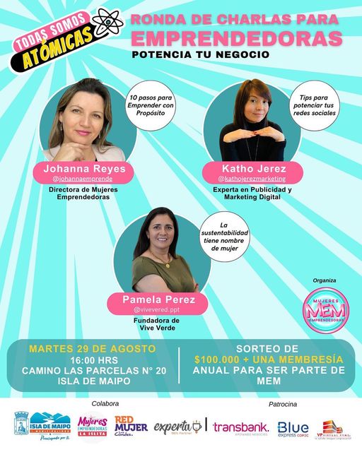 "Estamos muy contentas de seguir recorriendo localidades de nuestro país con nuestra gira Todas Somos Atómicas, y que nos ha permitido llegar a cientos de mujeres y emprendedoras de distintos sectores y edades con el objetivo de capacitarlas o ayudarlas con ese primer empujón que muchas necesitan para emprender?, señaló Johanna Reyes, Directora Ejecutiva de Mem.